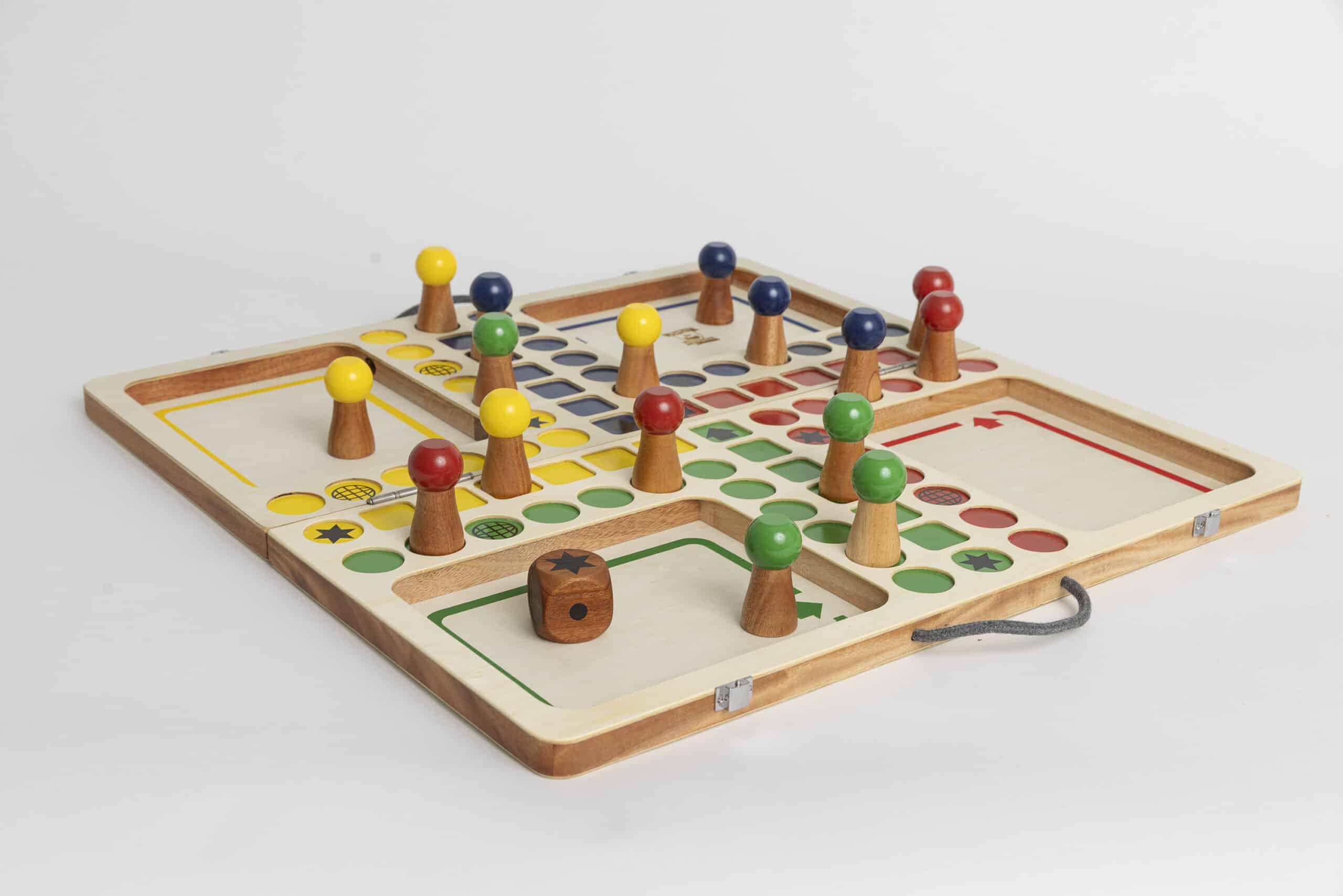 Kæmpe Ludo i kuffert. -Så er der styr på brikkerne!